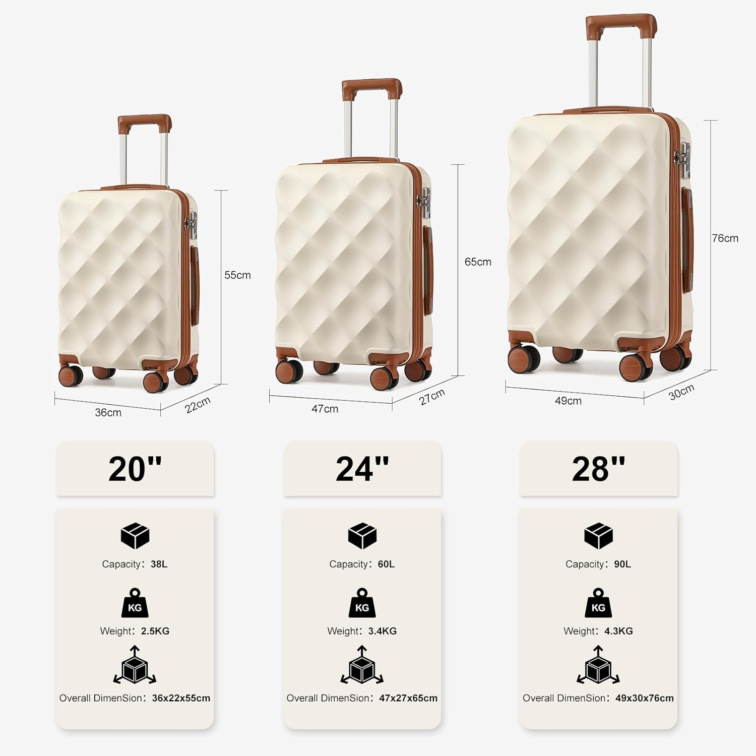 5 PIECE LUGGAGE SET – Toiletry Bag: 29x13x15cm. Capability: 12L. Weight: 0.1kg; Journey Bag: 40x20x25cm. Capability: 35L. Weight: 0.375kg; Cabin Suitcase: 55x36x22cm. Capability: 38L. Weight: 2.5 kg. 24″ Suitcase: 65x47x27cm. Capability: 60L. Weight: 3.4 kg. 28″ Suitcase: 76x49x30cm. Capability: 90L. Weight: 4.3 kg. (All dimensions and weights are approximate, however as correct as doable)
