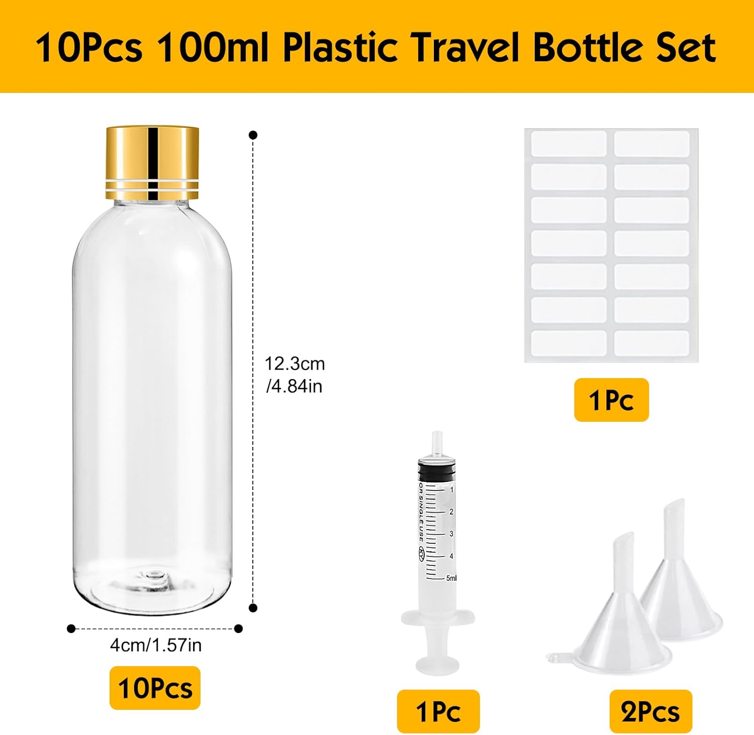 【10pcs 100ml Journey Bottle Set】The journey set contains 10pcs 100ml empty bottles Golden Lid, 2pcs funnels 1 white sticker and 1 Syringe. The amount can meet your journey wants.