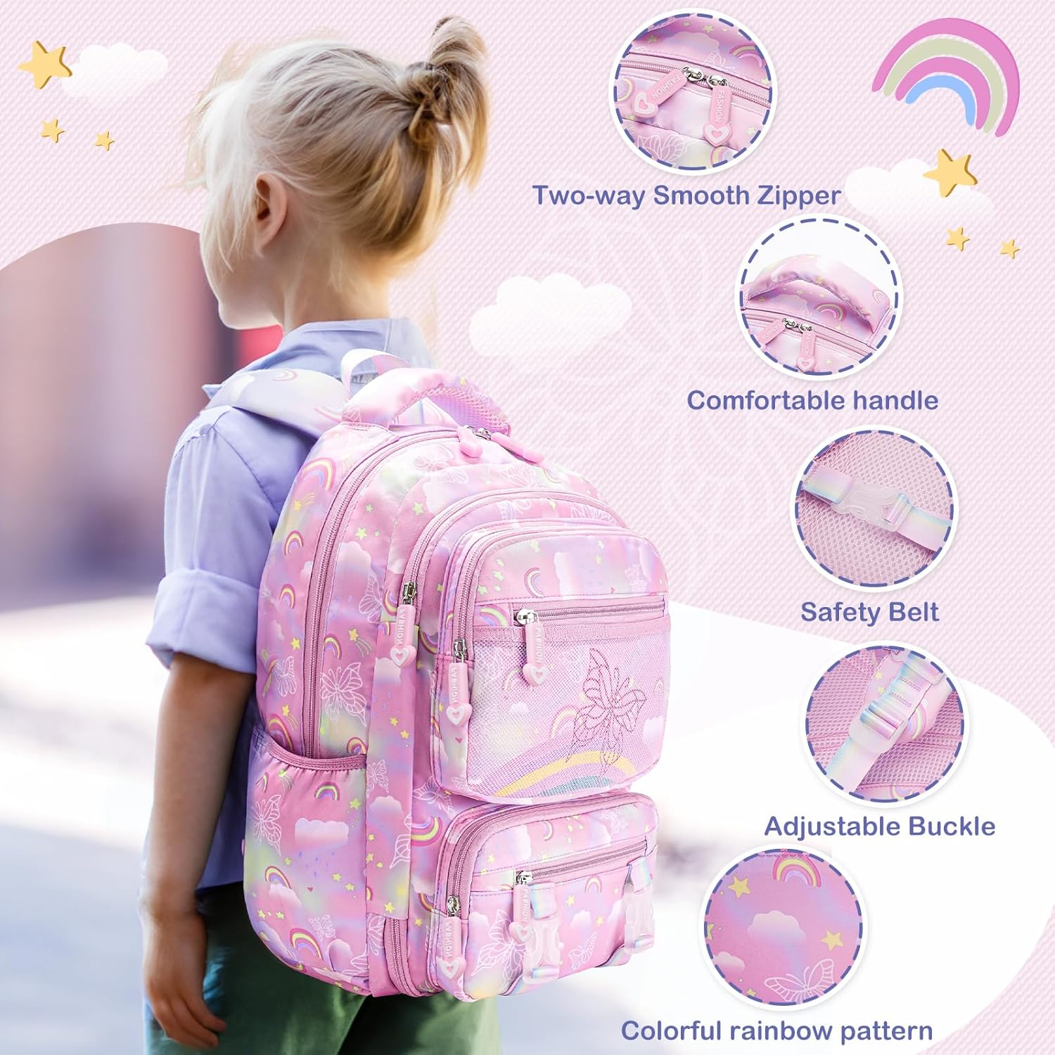Our college baggage are properly made and meet ergonomic design, in the meantime, with rainbow sample, massive area and compartmentalised design, your children will develop good behavior of organisation from a bit of lady.