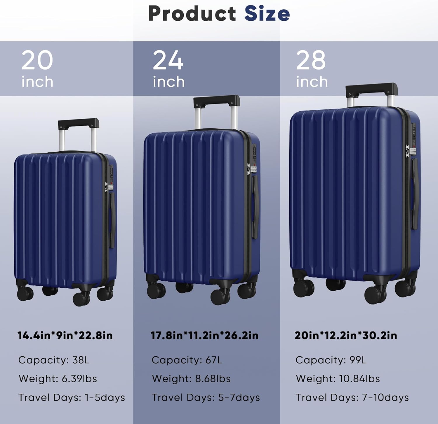 TRAVEL HARDSIDE SUITCASE: SHOWKOO Baggage Giant Measurement 28inch (30.2inx12.2inx20 in, 99L, 10.84LBS) has a big space for storing, appropriate for medium and long-term journey. SHOWKOO Baggage has a 2-year world guarantee, in case you have any questions, please contact us, we are going to make you happy