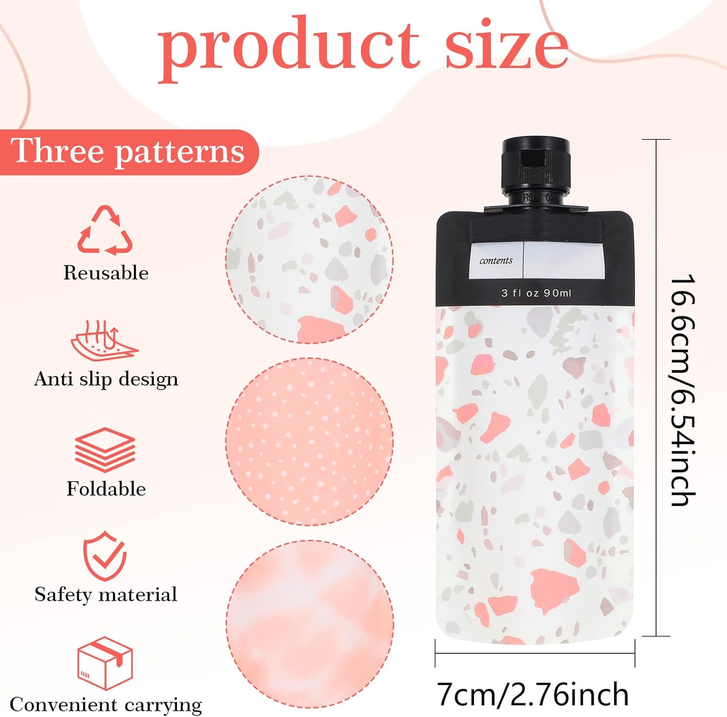 【Leak Proof Empty Squeeze Pouches】Journey bottles for toiletries characteristic a sublime printed design that provides a contact of fashion to your journey necessities. With a mild squeeze, you possibly can simply dispense the right quantity of your favourite lotion or shampoo, making your journey routine easy and pleasant