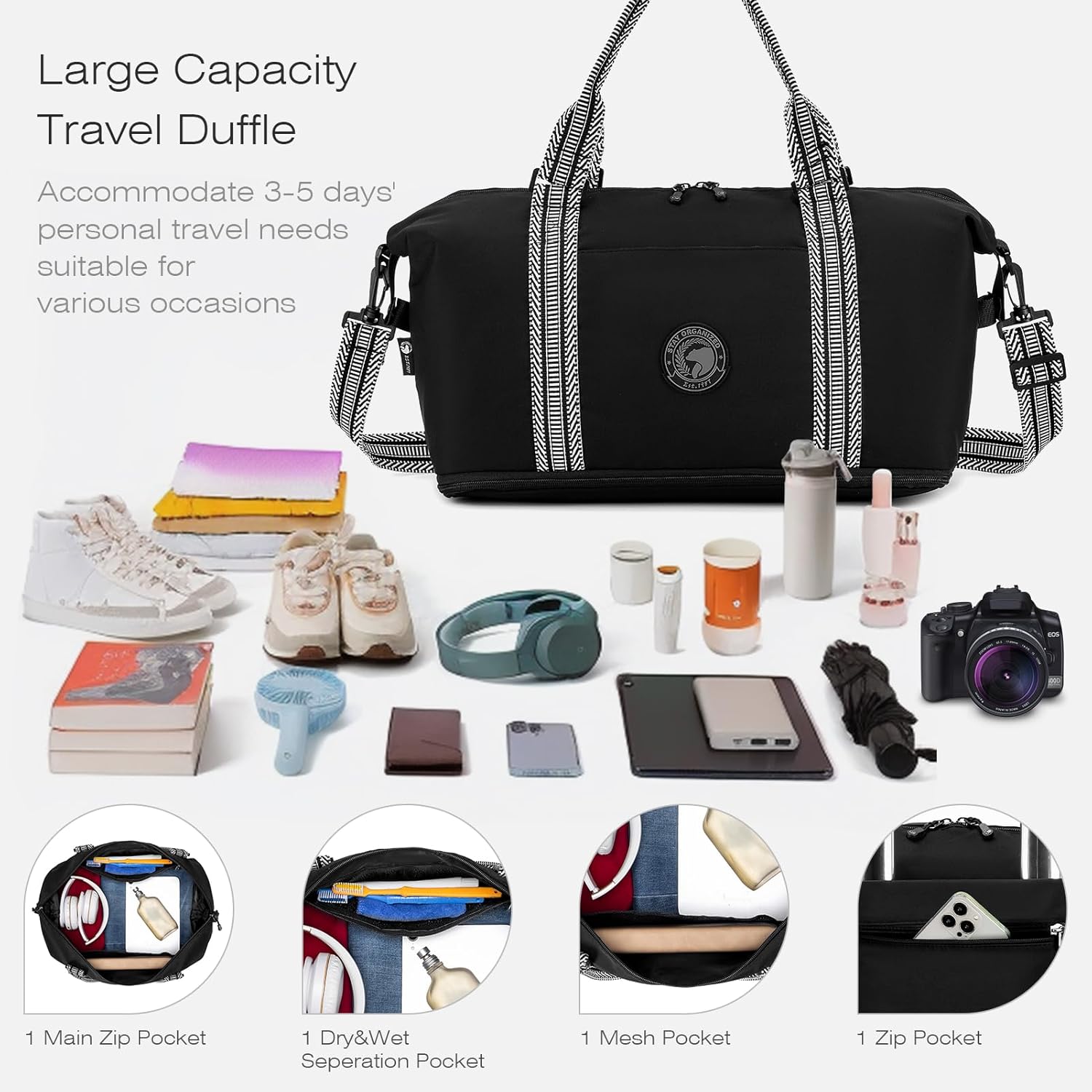 A number of Pockets Moist&Dry Seperation Design: it options 1 entrance small pockets for fast entry objects, 1 open mesh pocket and 1 dry&moist seperate zipper pocket in the principle compartment. Massive sufficient to suit 3-5 days travelling objects corresponding to garments, sneakers, blanket, towel, tissues, moist wipes, toiletries and extra.
