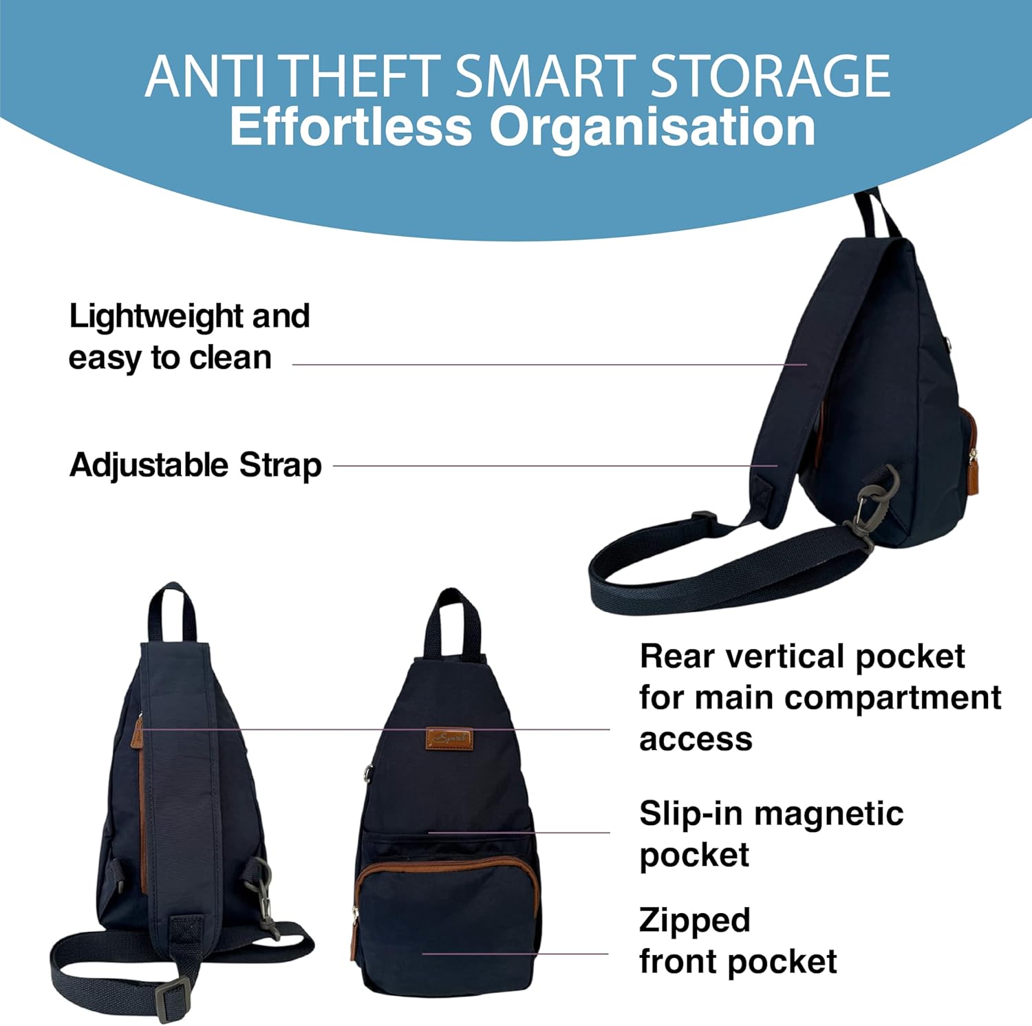 STAY ORGANISED, TRAVEL LIGHT: The Spirit Waterproof sling bag, measures 18cm extensive on the base, 32.5cm excessive, and 8cm deep. It options one fundamental part which ensures environment friendly storage and easy accessibility to your gadgets. With a completely adjustable shoulder straps, it affords consolation, whereas its zippers assure safe closure, stopping unintentional spills or loss. SECURE AND ORGANISED ACCESS: This comfy rucksack options one fundamental part which is accessed on the again through a vertical zip – anti theft and inside this part there’s additionally a slip-in pocket. LIGHT PORTABILITY: The waterproof backpack combines comfort with practicality. It options one slip-in pocket on the entrance of the bag secured with magnetic press stud closure. Moreover, a zipped pocket on the entrance offers safe storage for valuables. With its light-weight design, this backpack is right for prolonged journey or day by day use. ADAPTABLE COMPANION: This rucksack excels in versatility, tailor-made for journey, mountain climbing, tenting, and on a regular basis use. Its waterproof functionality ensures your belongings keep dry, making it excellent for outside adventures or day by day commutes in unpredictable climate. It affords dependable safety and comfort. VERSATILE: This backpack incorporates a totally adjustable shoulder strap that may be worn historically on the left or proper shoulder or transformed right into a day fashion bag and worn on the entrance of the physique. This versatile design offers ergonomic consolation and permits for seamless transitions and enhancing adaptability.