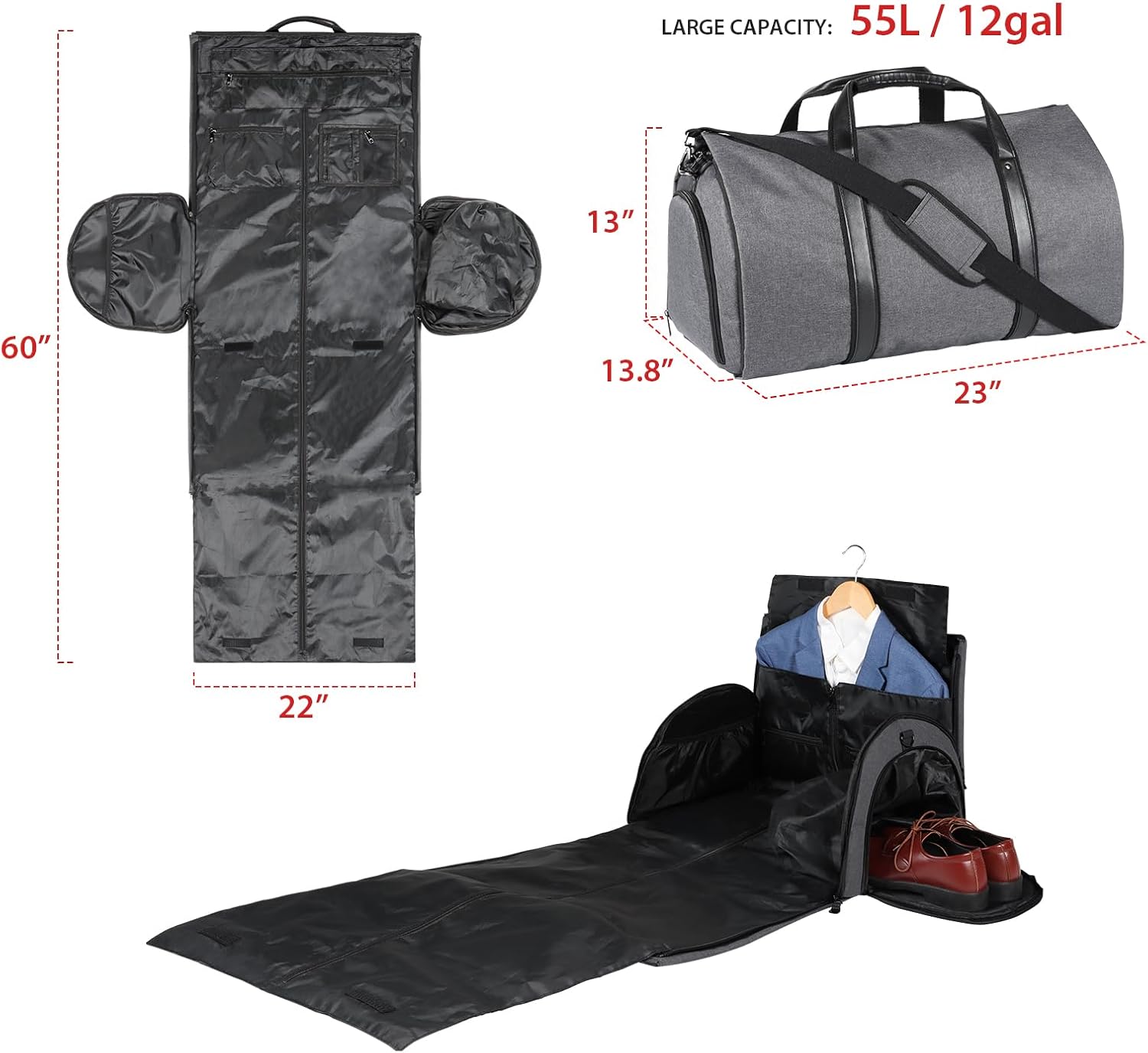 [Dimension ] : Garment Bag: 60″L x 22″W, 55L Duffel Bag: 23″L x 13.8″W x 13″H; The intelligent design match for the airline necessities, ample area, and organizational options make it best for the individuals who typically go for a enterprise journey, formal social gathering, trip, weekend away, health club, or touring performances.