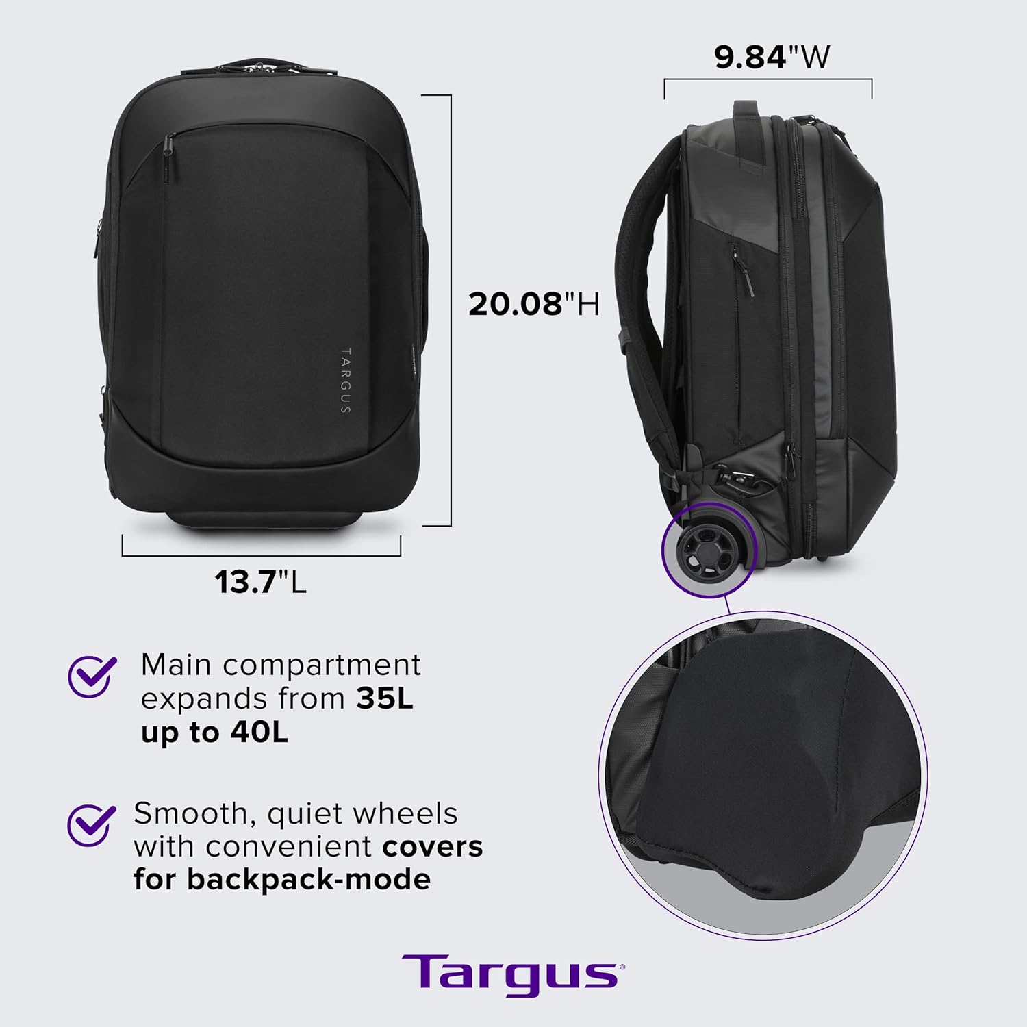 Targus black rolling backpack with infographics showing dimensionsTargus black rolling backpack with infographics showing dimensions