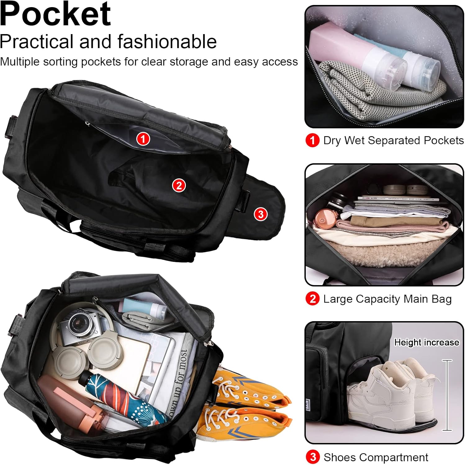 👜【Multifunctional Weekend and In a single day Bag】 A number of Categorized Pockets, 35L Giant Capability, Clear Storage And Straightforward Entry. This sports activities gymnasium bag is a complete of seven pockets — 1 spacious important pocket, 1 shoe compartment, 4 exterior pocket and 1 moist pocket for moist garments, toiletries or towels, protecting all of your necessities properly organized.