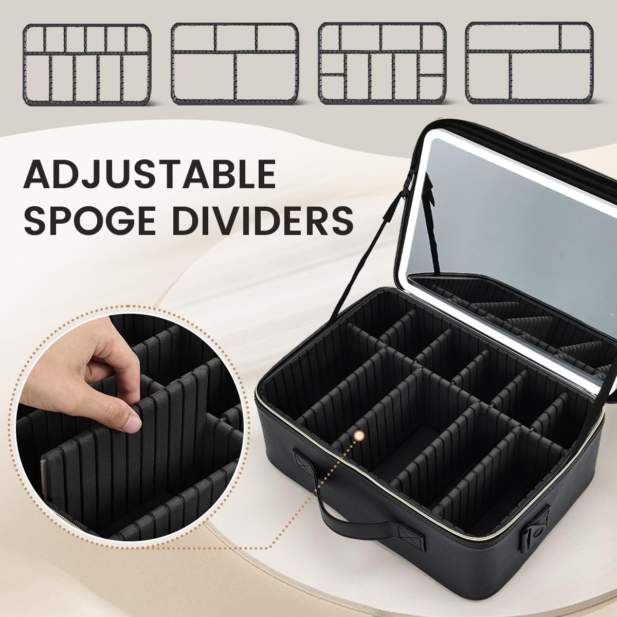 Travel Make up Bag with LED Mirror Cosmetic Bag with Compartment Makeup Box Organiser Beauty Case Luggage Cosmetic Case Vanity Case, Black, Large