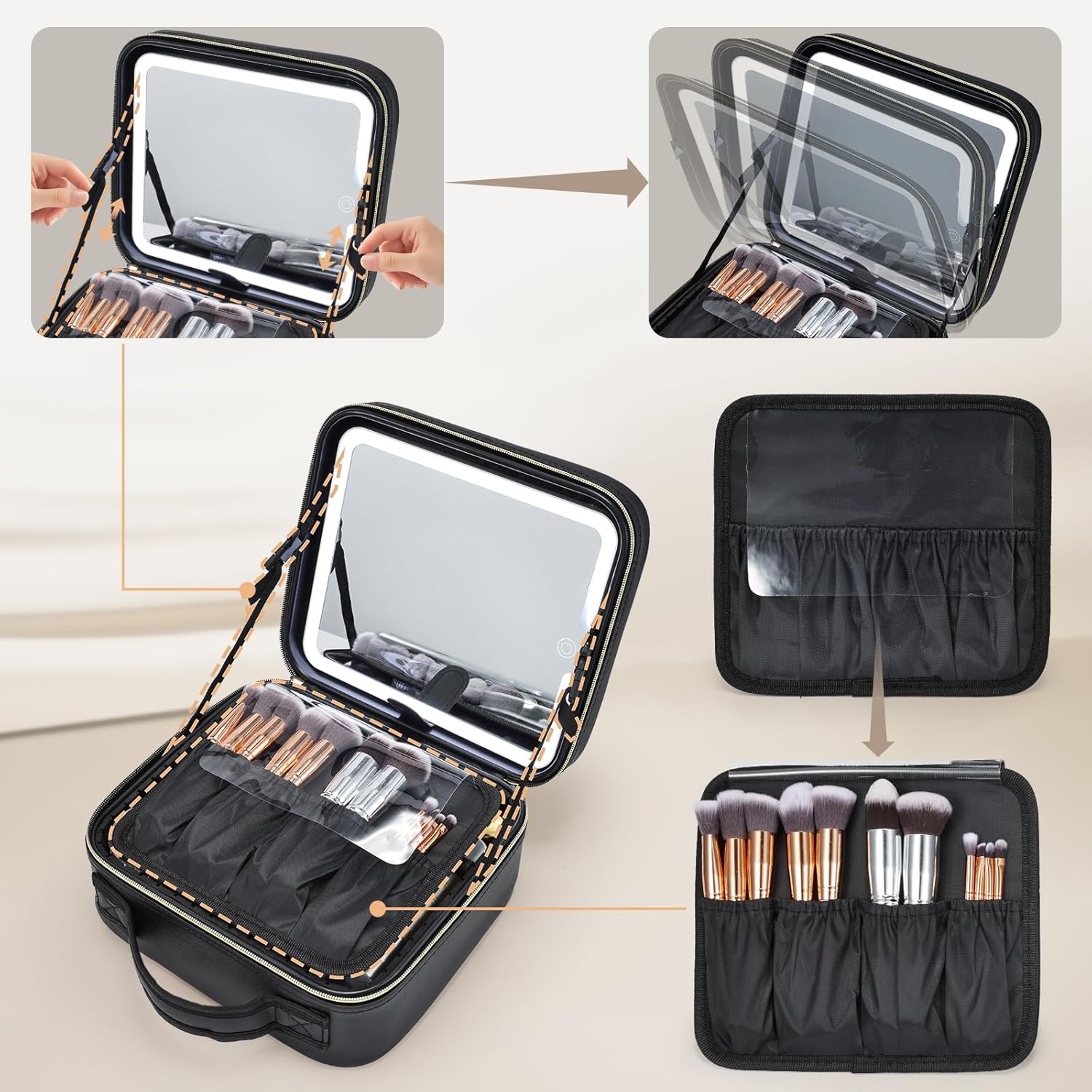 Make-up Bag with Led Mirror: Massive capability make up organiser bag with massive make-up brush storage board and led mirror.