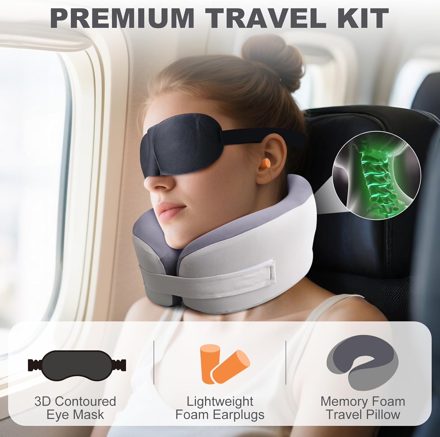 PERFECT TRAVEL SET:Our journey neck pillow set full with a contoured eye masks, noise-blocking earplugs and Transportable storage bag.The reminiscence foam journey pillow could be very mushy and will be simply fold into journey bag,and The handy hook makes it straightforward to hold anyplace you go