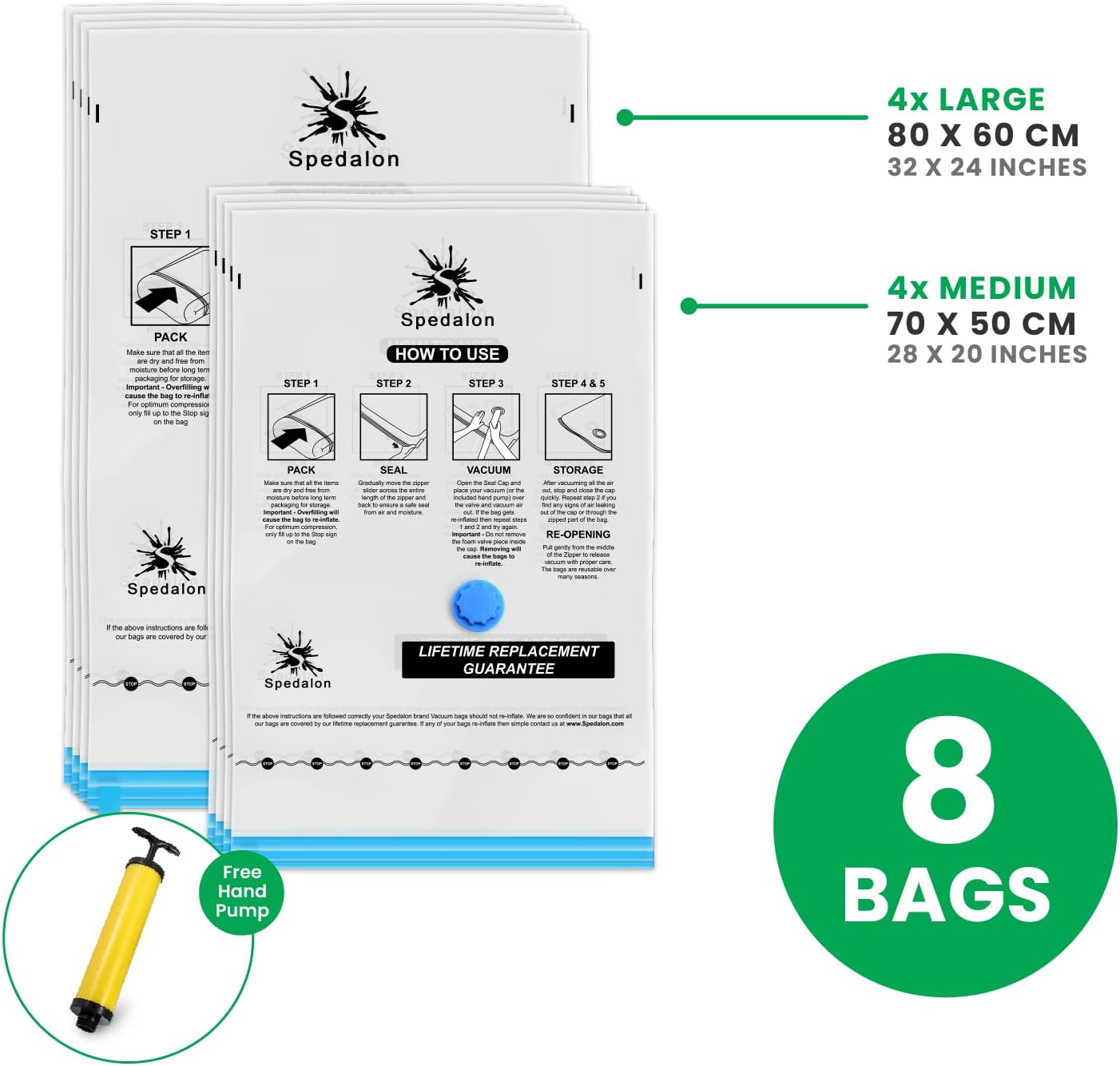 MORE BAGS || MORE VALUE – 8 x Vacuum compression luggage – Extra luggage than every other model. INCREASE YOUR STORAGE SPACE with out having to wash out your closet! Our Jumbo Spedalon area saving luggage are an excellent answer for including extra space for storing to your wardrobes, baggage, closets, garages, basements, lofts, suitcases & backpacks.