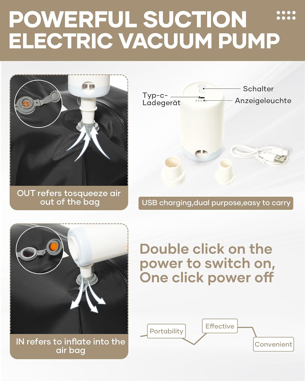 【 Moveable Air Pump】Every airbag is supplied with a chargeable air pump that may inflate and inhale. The air pump offers two nozzles, every answerable for totally different features. The air valve is marked with IN indicating inflation into the vacuum bag; The OUT mark on the air valve signifies the extraction of air from the vacuum bag. It might probably meet numerous utilization eventualities and can be utilized a number of instances after being absolutely charged.