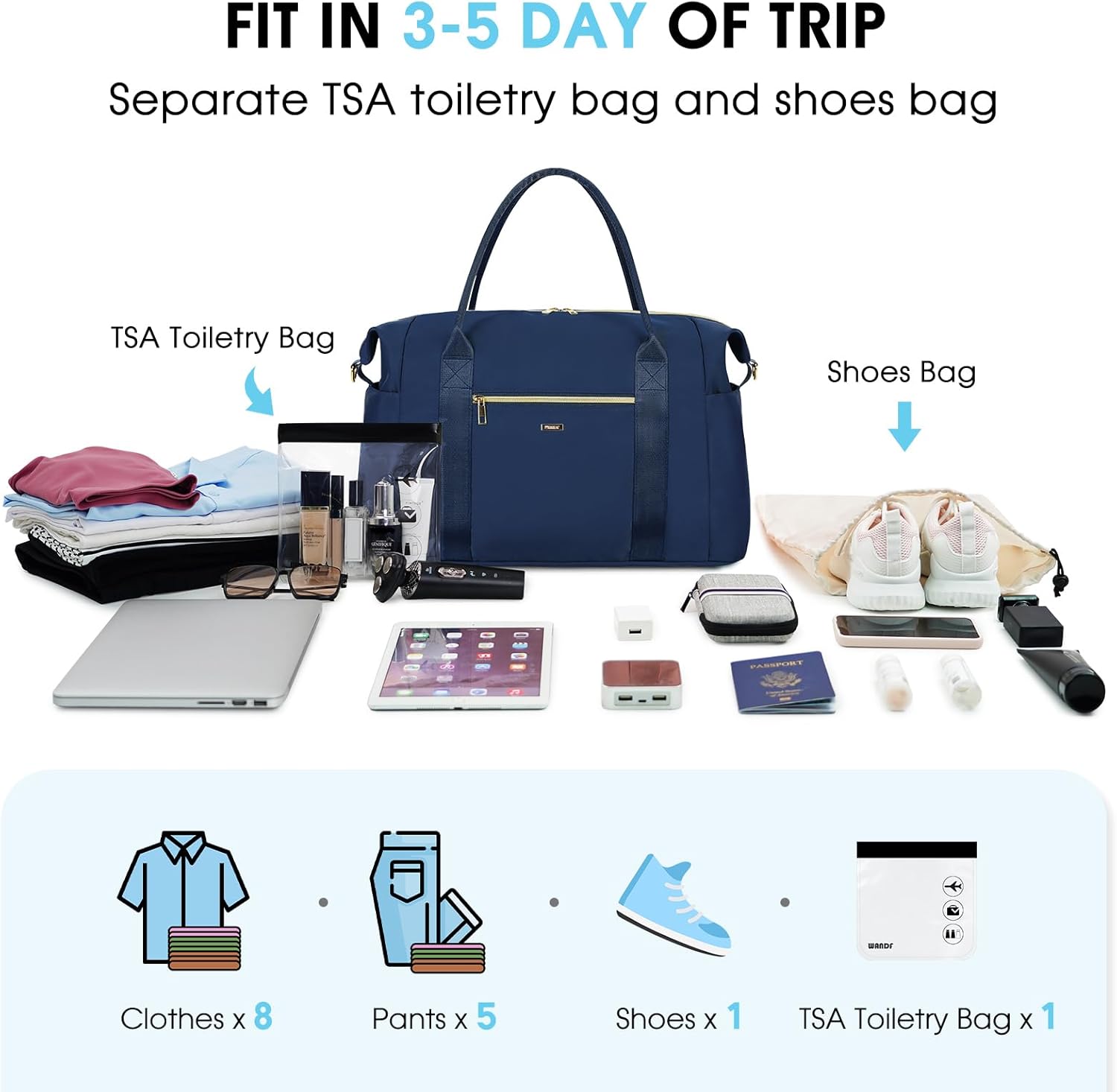 【SEPARATE TSA TOILETRY BAG】WANDF Journey Bag options an extra clear toiletry bag that complies with TSA 3-1-1 liquids guidelines, permitting safety personnel to simply see the contents with out having to open it, helps expedite the safety screening course of.
