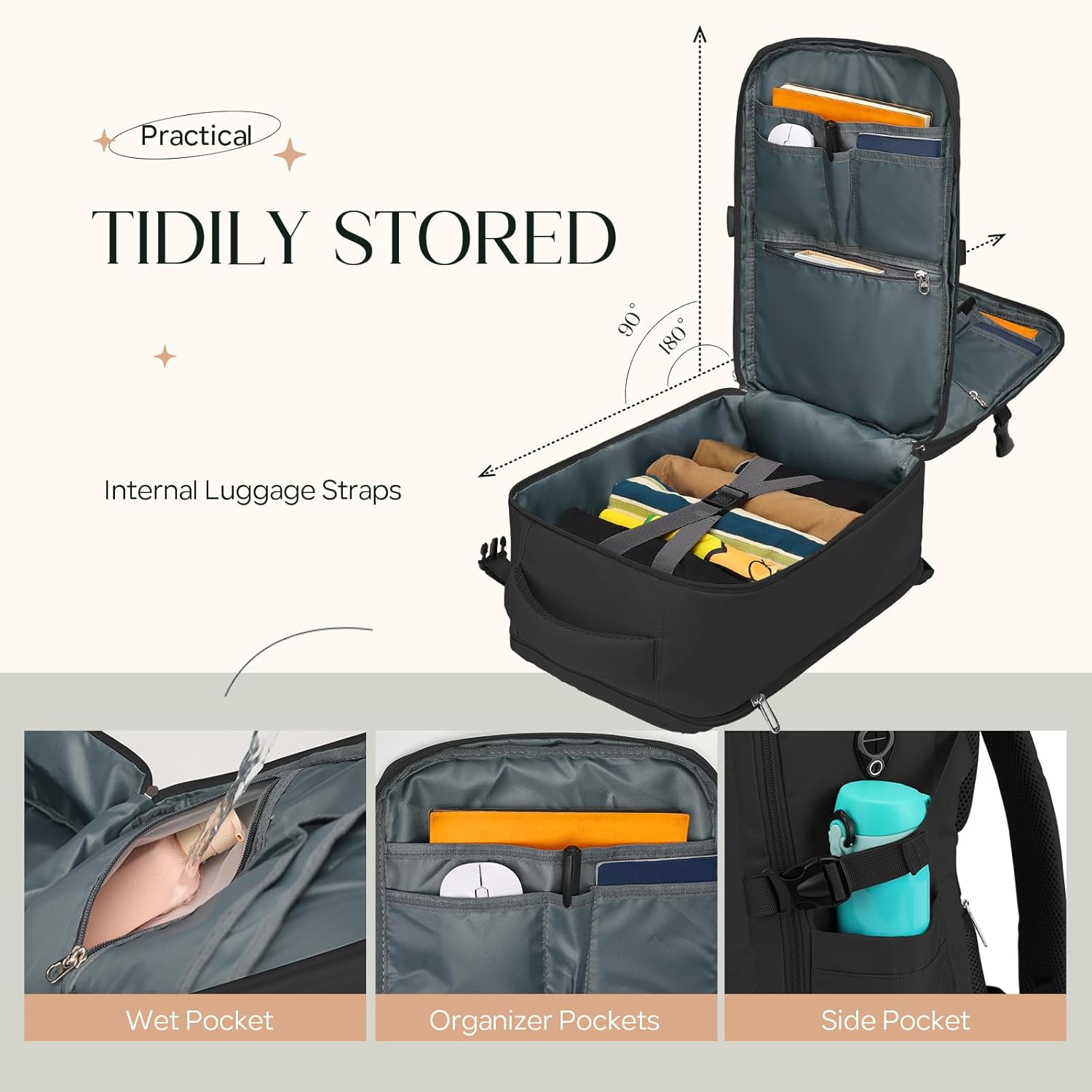 Comfort and Group:This cabin backpack combines the performance of a carry-on bag and a suitcase, opening a full 180° for simple entry throughout safety checks. It incorporates a separate waterproof compartment for storing moist gadgets and a number of small pockets for higher group. Moreover, the principle compartment consists of straps to maintain your garments neatly in place throughout your travels